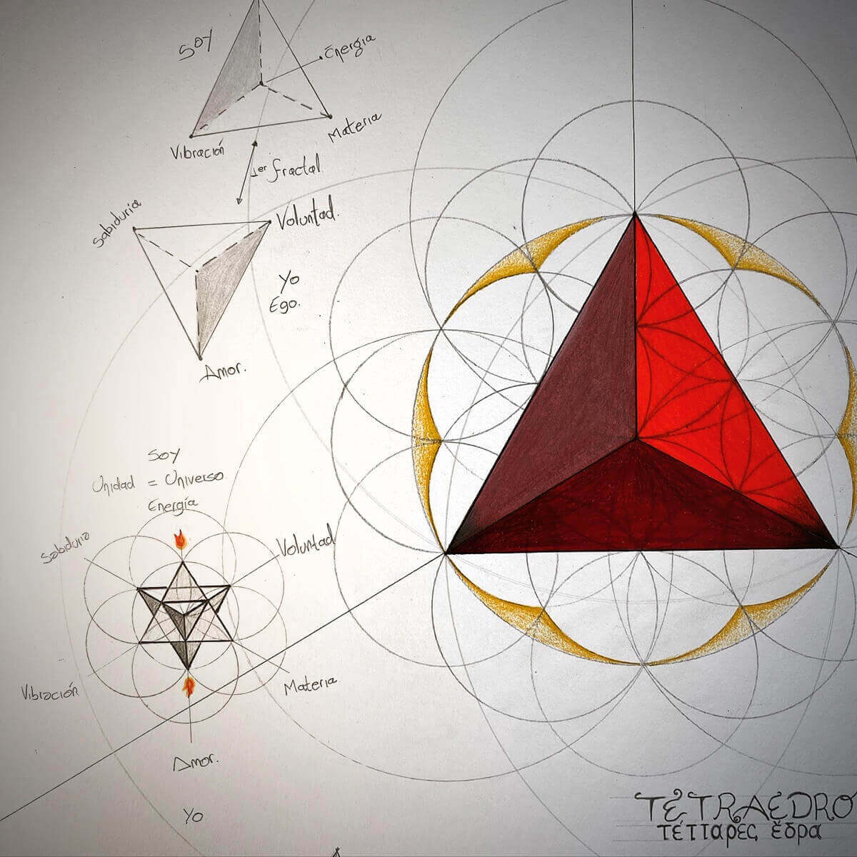 El tetraedro 🔺es la primera red geométrica y de conciencia que se manifiesta en el universo. La Mente universal – Unidad que desde el primer vértice se refleja en los 3 vértices restantes: Vibración, Energía y Materia. Esta primer formación tetraédrica se fractaliza sobre si misma creando un nuevo tetraedro: Primer vértice: yo/ego que mediante la Sabiduría, la Voluntad y el Amor ancla la energía material con la energía etérica , uniendo la esencia de las dos trinidades y creando la red geométrica merkabah (Tetraedro estrella, unión de 2 tetraedros 🔺🔻), el cuál es el cuerpo y vehículo de luz que constituye el yosoy o super-yo, y que permite la expansión del ser uniéndolo a la base cósmica y universal (Ser multidimensional).